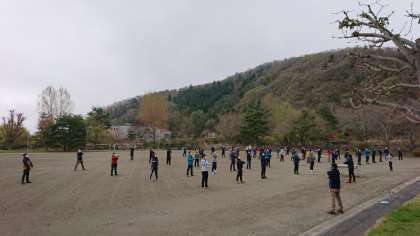 おはようございます。移動教室の朝は、園庭でのラジオ体操から始まります。残念ながら、曇り空で富士山は雲に隠れています。朝ごはんを食べて2日目の活動に備えています。(桝田)