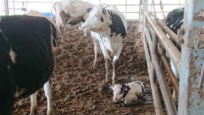 最後の見学地は酪農体験ができる松下牧場です。30分前に生まれたばかりの子牛を見ることができました。(桝田)