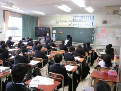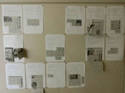 昨日に引き続き、2年生が5時間目にNIEタイムを行いました。今日は、昨日作成したワークシートを基に、4人組班で発表を行い、班の代表者が全体に報告しました。出来上がったワークシートは、廊下に掲示しました。(大竹)