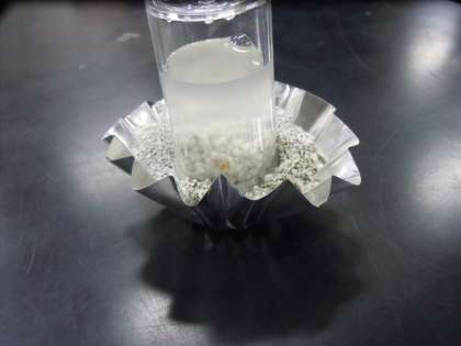 単元「電流」の放射線利用に関する発展的学習として、放射性廃棄物の処分方法や放射線の遮蔽性について学びました。ゲストティーチャーは原子力発電環境整備機構の皆さんです。放射性物質を閉じ込めるための緩衝材に使われるベントナイトという粘土鉱物を使って実験を行いました。ベントナイトはペットのトイレの砂にも使われている身近な物質ですが、水を吸うと膨張し、膨張後は水を通しにくくなるというベントナイトの特徴を知ることができました。(桝田)