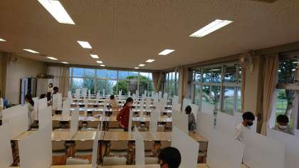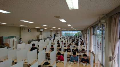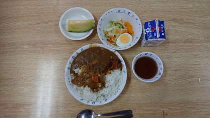 夕食は林間学園定番のカレーライスです。何度食べてもおいしいです。食事係が準備と片付けを手際よく進めています。ごくろうさま。(桝田)