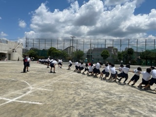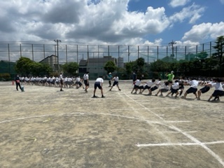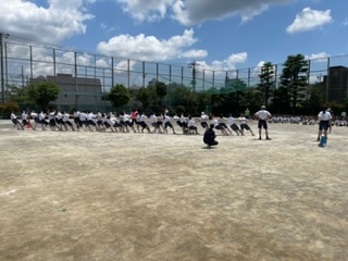 1年綱引きです。1位C組、2位A組、3位B組でした。各クラス共、腰が高いのが気になりました。いかに腰を低くして勝負するかが、勝敗の分かれ目になると思います。