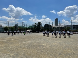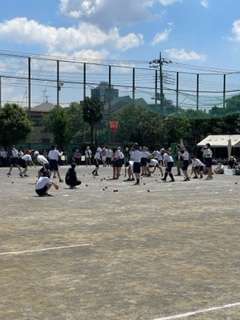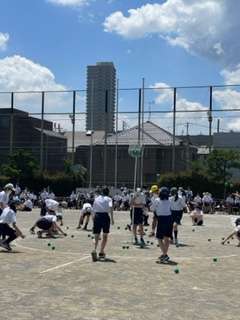 ?玉入れです。学年が上がるにつれて、籠に入る玉の数が多くなります。