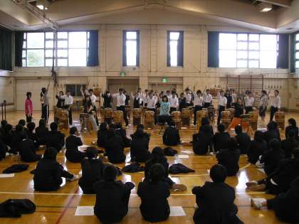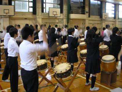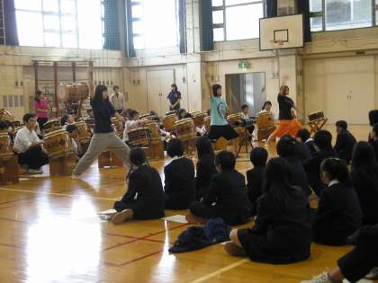 今年も、都立深沢高校の生徒と先生に来ていただき、2年生が和太鼓の体験指導を受けました。高校生の迫力ある演奏にびっくりしていました。素晴らしい体験ができました。ご指導ありがとうございます。