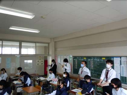 国士舘大学文学部教育学科の学生の皆さんが駒沢中学校に来校して、授業参観を行いました。教育学科で教員免許取得をめざす学生を対象とした「教育学の基礎」という科目の一環として、学校の教育活動を参観していただきました。学生の皆さんは、生徒の授業に打ち込む姿に感心していました。駒沢中での経験を今後にいかしてほしいなと思っています。(桝田)