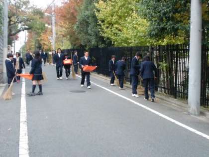 この季節、タンチ山はじめ、樹木が多いので、大量の落ち葉が毎日積もります。敷地の周りの道路も落ち葉がいっぱいです。昨日は1年生、今日は2年生の美化委員、学級委員、生活委員、生徒会役員を中心にたくさんの生徒が参加して落ち葉掃きをしました。季節の行事です。