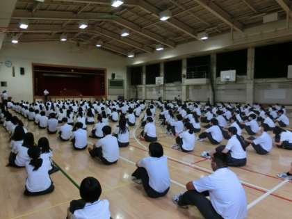 遅くなりましたが、9月1日の木曜日に2学期始業式が行われました。当日の朝の登校の様子ですが、8時25分にはほとんどの生徒が登校しており、2学期に向けての意識が高いのが見て取れました。また、1,3年生は体育館への集合、2年生は教室での準備ととても落ち着いて静かに集まることができました。