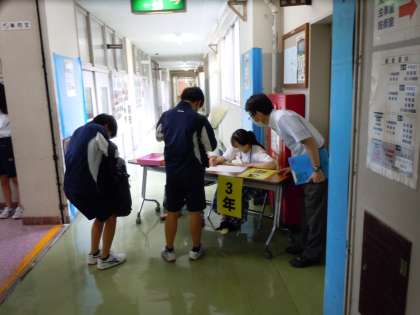 10月21日に校内で行われる漢字検定の申し込み受付をしました。いつものように学校支援地域本部の皆さんに協力していただきました。いつも朝早くからありがとうございます。卒業生の大学生も参加してくれました。申し込みを済ませた皆さん、検定当日にむけてしっかり準備しましょうね。(桝田)