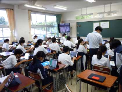 昨日から定期考査2週間前に入っています。この期間の朝の学級タイムは朝学習となり、各自で自学自習を進めることにしています。1年生では、タブレット端末に入っている学習アプリ「Qubena(キュビナ)」を活用して朝学習に取り組みました。各自の課題に応じて最適な学習となるように工夫されたアプリです。家庭学習でも活用していきましょう。2・3年生でも明日以降に「Qubena」を活用した朝学習に取り組みます。(桝田)