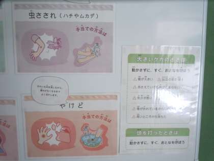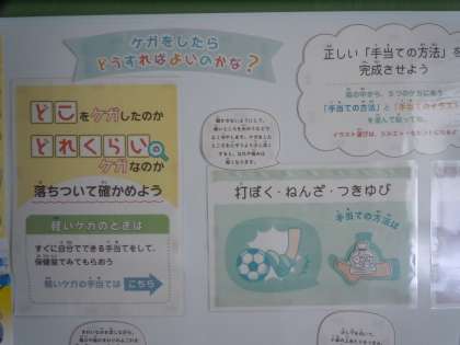 今月は「ケガの対処法」を知らせてくれます。ケガはできればしたくないところですが、生活する中では避けられないものとも言えます。正しい対処法を知っていれば、大事に至らずに済むはずです。大切な「生きる力」ですね。保健委員会の皆さん、いつもわかりやすい掲示作成ありがとうございます。(桝田)