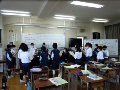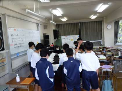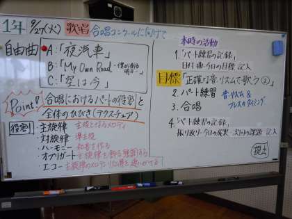 若竹祭(合唱コンクール)まであと1ヶ月。1年生は初めての合唱コンクールにむけて、音楽の授業で課題曲と自由曲に取り組んでいます。本日の目標は「正確な音・リズムで歌う」ことです。パートに分かれてパートごとに合わせていました。自由曲の「夜汽車」は自分が1年生の担任をしていたときに使っていた曲なので、そのころのことを思い出してとても懐かしい気持ちになりました。(桝田)