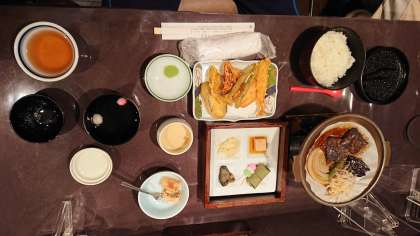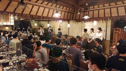 到着式で宿舎の皆さまにごあいさつをして、お待ちかねの夕食です。奈良の名産品を取り入れたごちそうです。何が奈良の名産品だかわかりますか?(桝田)