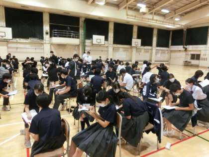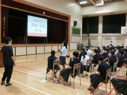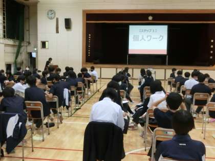 後半は、ワークタイムを行いました。まず、「私の自己PR(よいところ・自分らしさ)」「15年後のなりたい自分」という質問に対して、自分の考えを書きました。そして、隣に人と発表し合い、みんなの前で発表しました。(大竹)
