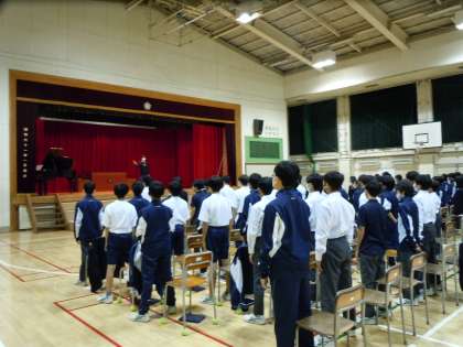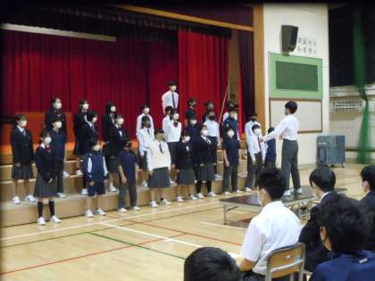 初めての合唱コンクールに挑んでいます。ステージで合唱するために覚えなければならない動きがたくさんあって、戸惑いもあることでしょう。他のクラスの動きをよく見て、しっかり確認してくださいね。元気のよい歌声を体育館に響かせてください。(桝田)