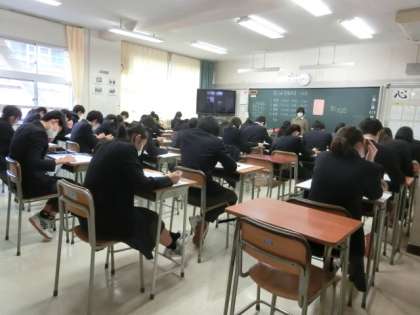 今日、第1日目は理科、英語、音楽の試験です。写真は、3時間目英語のリスニング、3年生の様子です。(大竹)