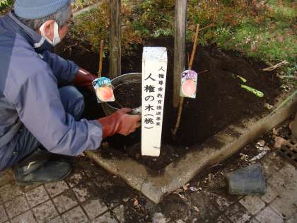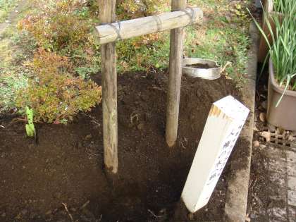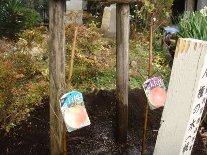 つい2年ほど前まで小さな実をつけていた桃の木ですが、どうもしっかり根付かなかったようで枯れてしまいました。そこで本日新しい苗を植えました。「桃栗3年、柿8年」といいますから、結実まで時間がかかると思いますが、これからの成長を見守ってくださいね。