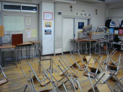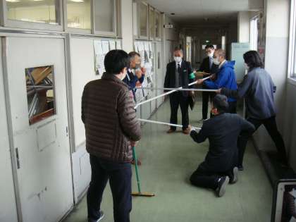 生徒は教室でバリケードを作り、窓側によって避難します。不審者進入の通報により現場にかけつけた教員がさすまたを使って不審者を取り押さました。