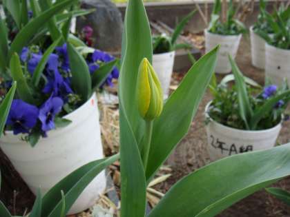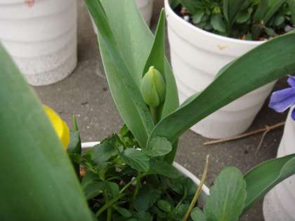 2年生技術の授業で球根を冷蔵保存して植え付けたチューリップは、もうつぼみが大きくなっています。チューリップが花を咲かせるには、一定の低温期間が必要なのだそうです。だから、冷蔵保存された球根は、植えられると冬が終わったと勘違いして花を咲かせようとするとのこと。不思議ですね。花が咲く時期の違いに注目して、植木鉢を観察してみましょう。(桝田)