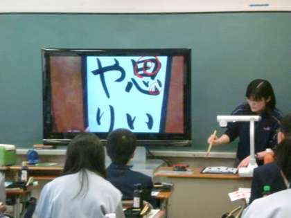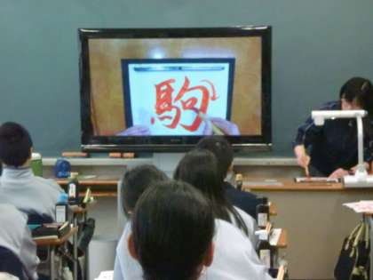 本日の5校時、1年B組で国語(書写)の授業研究を中心に校内研修会を実施しました。1年生の書写のまとめとして「自分の好きな言葉を書いてみよう」という単元の1時間目でした。あらかじめ提出した好きな言葉を、国語の先生が朱書したお手本を見ながら、集中して書いていました。書画カメラとモニターを使っての楷書と行書の復習説明や、作品の評価を食い入るように見る生徒の姿が印象的でした。小学校での指導が身についていて、準備や片付けも合理的で、小学校の先生方に感謝です。