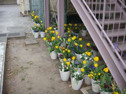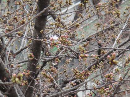 昨日までの暖かさが春を運んできたようです。チューリップが見事に咲きそろいました。つぼみが膨らんだ桜も、よく見ると開花しているのがわかりました。卒業式まで1週間、着実に季節が移り変わっていきます。(桝田)