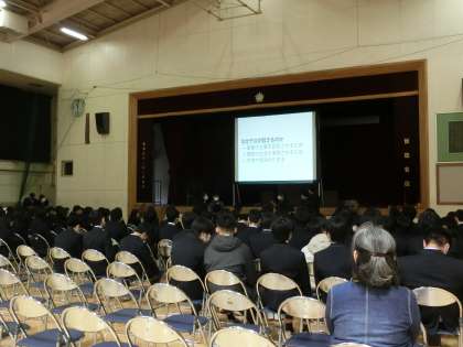 3学年では、3時間目に「持続可能な社会に向けて」をテーマとした総合発表会を行いました。この取り組みは、3年間の集大成として約1か月という長い期間をかけて今日まで班で協力しながら調べ学習を進めてきました。今日発表したクラス代表の班をはじめとして、どの班もアンケートをとってみたり、実験を行ってみたりと様々な工夫が凝らされており、3年間でここまで力がついたのだなと改めて実感しました。