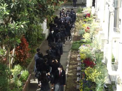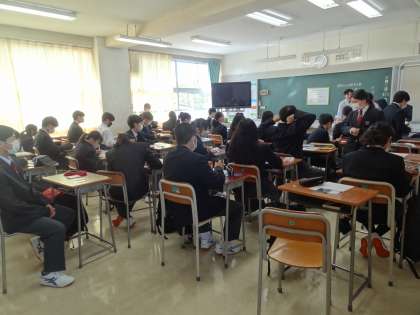 日光の差し込む中庭でクラス写真を撮りました。撮り終わった後教室に戻りました。1年生は生徒手帳を読みました。
