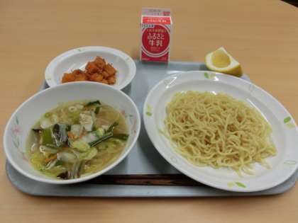 献立はつけサンマーめん、カルシウムビーンズ、河内晩柑、牛乳です。サンマーめんは、具だくさんでとろみのあるスープが特徴の神奈川県のご当地ラーメンです。「生馬麺」と書き、「生」は「新鮮でしゃきしゃきした」、「馬」は「上にのせる」という意味の広東語です。
