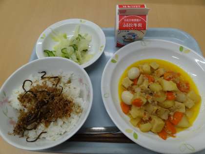 献立は、ごはん、カミカミ佃煮、じゃが芋のそぼろ煮、ひと塩野菜、牛乳です。佃煮は魚介類、海藻、野菜を甘辛く煮た料理です。江戸時代の初めに大阪から江戸の佃島(つくだじま)へ移住した漁師たちが、商品価値の低かった小魚や貝類、海藻などを保存するために調理したのが始まりです。