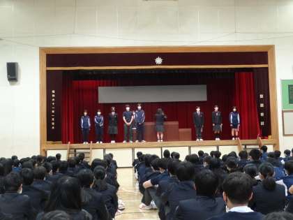 生徒会朝礼の時間に、生徒会役員の紹介の後、前期専門委員会委員長に任命証を渡しました。各専門委員会が委員長を中心に活発に活動してほしいです。各専門委員会の委員の皆さんよろしくお願いします。