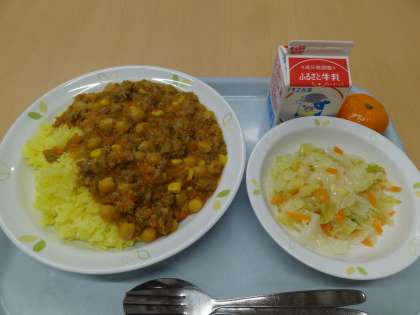今日の献立は、ひよこ豆のカレー、コールスロー、冷凍みかん、牛乳です。ひよこ豆は原産地が西アジアから地中海沿岸で、何千年も前から栽培されています。日本での生産は行われてなく、メキシコ、アメリカ、カナダなどから輸入されたものです。
