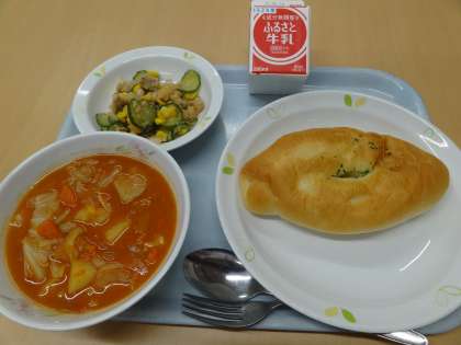 今日の献立は、ガーリックトースト、ボルシチ、ビーンズサラダ、牛乳です。ボルシチの色はトマトやビーツを使って赤い色を出しています。給食ではトマトをよく使っています。