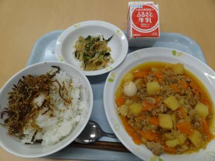 今日の献立は、麦入りごはん、カミカミ佃煮、じゃが芋のそぼろ煮、おひたし、牛乳です。カミカミ佃煮は、ちりめんじゃこ、塩昆布、白いりごまが入った噛みごたえのある佃煮です。よく噛んで食べましょう。