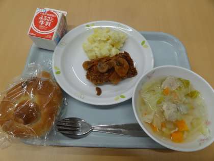 今日の献立は、セサミパン、いかのきのこソースがけ、クリームポテト、田舎風豆スープ、牛乳です。