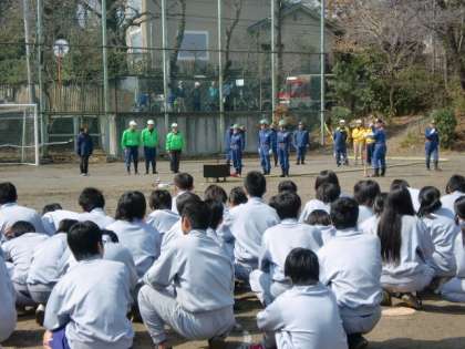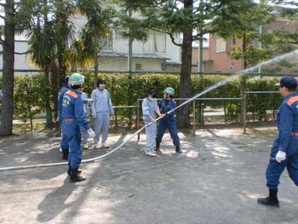 消防団による「スタンドパイプ」操法演示と、生徒の放水訓練です。