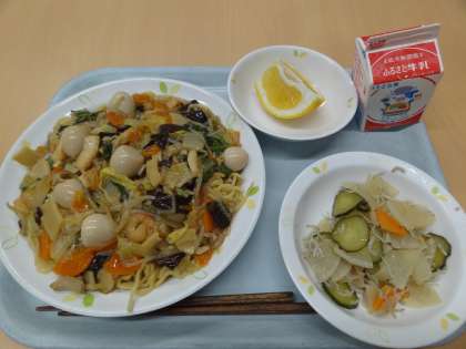 今日の献立は、五目あんかけ焼きそば、大根とじゃこのサラダ、河内晩柑、牛乳です。