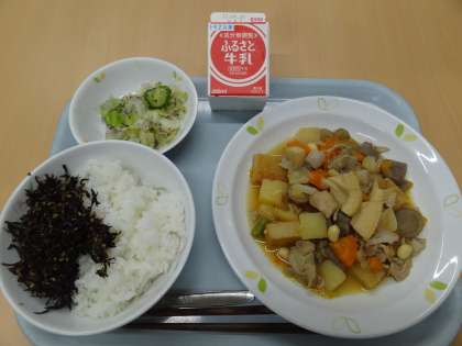今日の献立は、ごはん、ひじきのふりかけ、豆入り筑前煮、ゆかり和え、牛乳です。