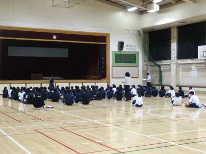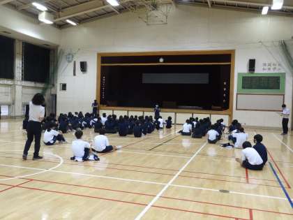 2年生は体育館で、水曜日から行われる定期考査に向けて授業を大切にしようという話や定期考査後に行うドッヂボール大会の話がありました。準備をしっかりしてくださいね。