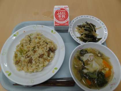 今日の献立は、レタスチャーハン、ワンタンスープ、もやしとわかめのごま酢和え、牛乳です。