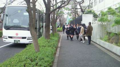 三年生は中学校生活最後の校外学習として、横浜に向けて出発しました。中華街見学、昼食の後、ミュージカル キャッツを鑑賞します。予定より5分早く出発して、環七を246号線に入りました。首都高に向かっています。