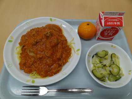 今日の献立は、スパゲッティミートソース、オニオンサラダ、冷凍みかん、牛乳です。定期考査の手応えはどうでしたか?