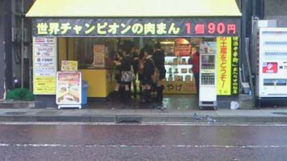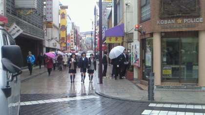 班行動です。雨は小降りです。まだ開いてない店が多いです。寒いので豚まんを食べている生徒も多いです。