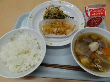 今日の献立は、ごはん、鮭のちゃんちゃん焼き、ごま和え、けんちん汁、牛乳です。