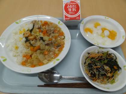 今日の献立は、あんかけチャーハン、小松菜と春雨のサラダ、フルーツ入り杏仁豆腐、牛乳です。