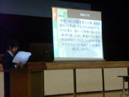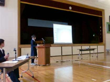 2年生は、一月末に職場体験を実施しました。その後、一人一人がレポートとして「職場体験新聞」にまとめ、クラスで発表会を行いました。今日は、2年生、1年生、保護者の皆さんの前で、クラスの代表が体育館で発表しました。新聞も良くできていましたが、パワーポイントも上手に活用したわかりやすい発表に、大きな拍手が送られていました。発表から、生徒が大きな成果を手にしたことがうかがわれました。