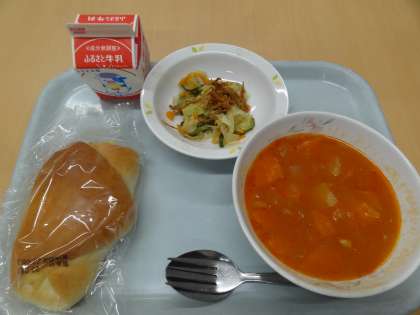 今日の献立は、ダイスチーズパン、ハンガリアンシチュー、ごぼうチップサラダ、牛乳です。