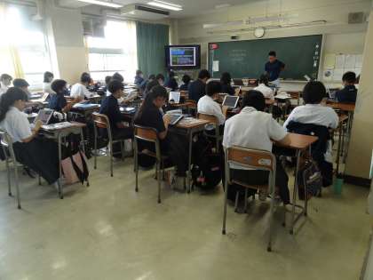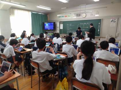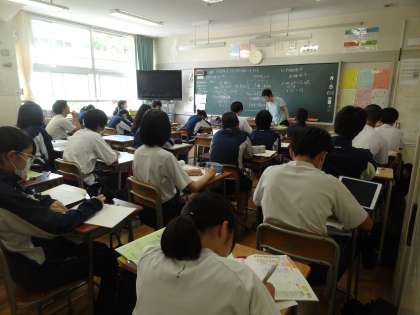 1校時の1年生は理科(写真)、保健体育(写真)、技術です。2年生は書写、保健体育、家庭科です。3年生は数学(写真)、社会です。