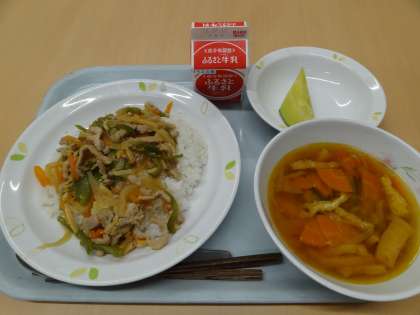 今日の献立は、チンジャオロース丼、かぼちゃのみそ汁、メロン、牛乳です。