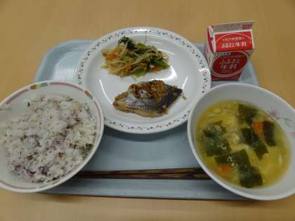 今日の献立は、ゆかりごはん、魚の香味焼き、おひたし、かきたま汁、牛乳です。
