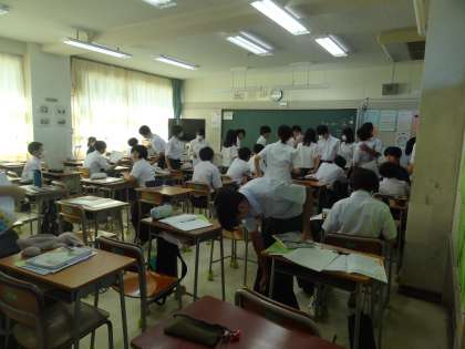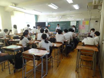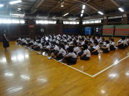 1年生は始業式の後、格技室で学年集会を行っています。2、3年生は各教室で提出物の確認をしています。