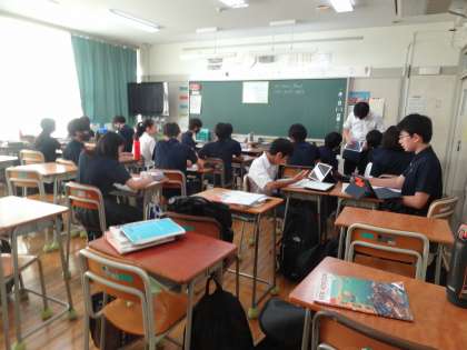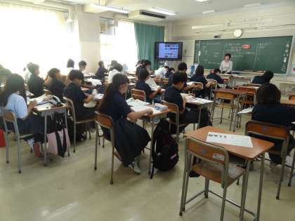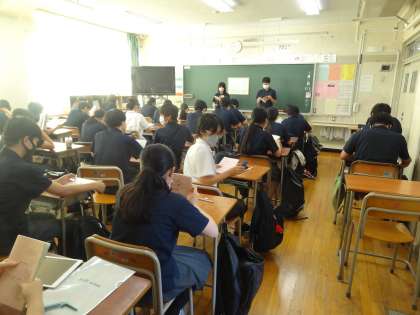 1校時の1年生は音楽、保健体育、社会(写真)です。2年生は職場体験に係る事前打ち合わせををしています。3年生は修学旅行のしおりの読み合わせをしています。
